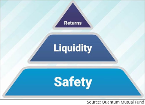 Safety: This principle puts the Safety of investors' money at the base of the pyramid, which means that this is the bare minimum requirement that needs to be fulfilled by all instruments purchased by the Fixed Income team. Hence for the Quantum Liquid Fund, Pankaj and the team buy ONLY AAA rated government securities - the safest form of investment.