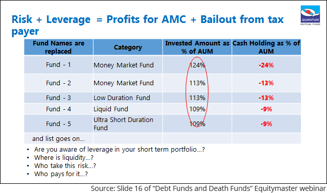 Liquidity: this is then followed by Liquidity - whichever instrument the Fixed Income team invests in should be in a position to be easily liquidated. Therefore, if investors need money, Pankaj can easily liquidate the instrument and re-pay investors - therefore never, ever having the need to seek bailouts from the RBI or anyone else!