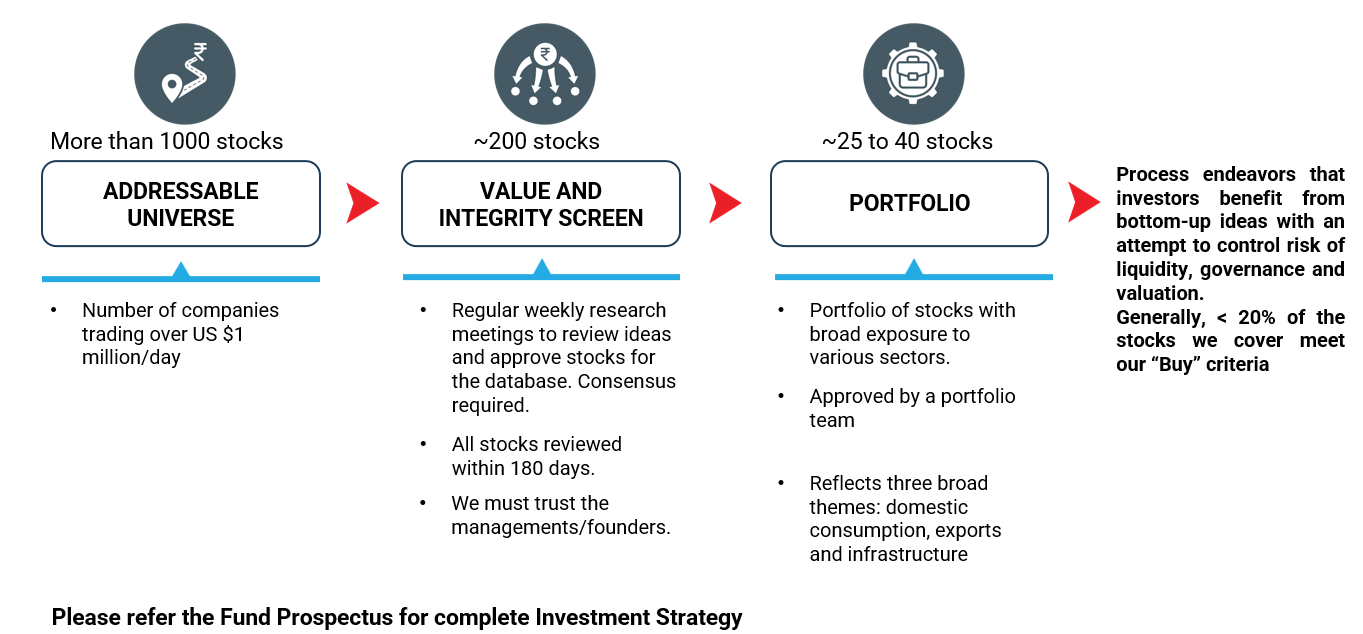 After filtering for liquidity and governance risk, our Investment strategy is to buy a stock when the current price is at a discount to our forward estimate of the intrinsic value of a company with identified catalysts which we believe will help bridge the gap between the share price and the forward intrinsic value.