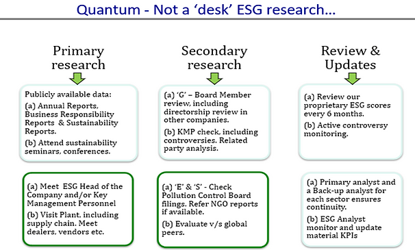 Quantum believes that verification of ESG credentials still warrants a detective lens, and one cannot and must not rely on self-disclosures. Information can also be obtained from many unconventional sources like NGOs, local communities, regional/regulatory boards.