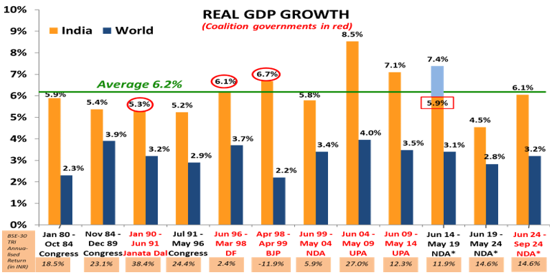 Source: World bank, RBI and www.parliamentofindia.nic.in as of September 2024. Note: The number in red rectangle is from a changed data series starting Jan 2015. While a “superior” series, there is no comparable number to equate the “New” with the “Old.” Most economists deduct 0% to 1.5% from the “New” to equate to the “Old”; therefore, under Modi, the GDP has been at 5.9% at best matching the 5.6% under the BJP-led coalition government of Vajpayee that resulted in a rout for the BJP at the time of the next election in 2004. Please note that data used for World GDP from 2021 is a median annual estimate since quarterly data is not available, and India GDP data is governments second advance estimate released at the end of November 2024. The graph is only for representation and understanding purpose and does not assure any promise or guarantee that the historical performance is indicative of future results.