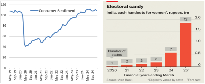 We do see some short-term remedies on course. Fiscal policies at the state level, across all parties in power, have turned towards supporting incomes and providing subsidies. 16 out of the 28 states now offer some form of direct income transfer to women. Various research now estimates that >0.5% of state GDP is spent only on women through bank transfers and other schemes7. This should alleviate some of the income concerns that seemed to have held back demand. This is the harsh reality, and politicians are the first to react to it. They know that over the last decade, growth has been weaker, incomes have been modest, and job growth hasn’t kept pace with the labor force. The only way to maintain social stability and political relevance is to provide cash transfers and income support, as the leader of the opposition, Rahul Gandhi, promised to voters as ‘khatakat’ – (like the brisk whirring sound of an ATM machine dispensing cash)8. Consumer sentiment and overall employment, which were already on the upswing and back above pre-COVID levels, should improve further, driving demand.