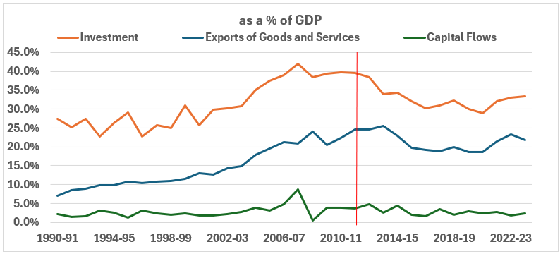 (Source: CMIE Economic Outlook; Annual GDP at current market prices; Investment=Gross Capital Formation; Total Capital Flows; Data till March-2024 )