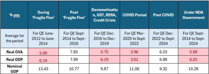 (Source: CMIE Economic Outlook, QE=Quarter Ended; shaded for levels below 6.5%; GVA = Gross Value Added; ‘Fragile Five – refers to period when India was bracketed with countries which were vulnerable due to high external current account deficit and inflation in an era of tightening FED policy and strong dollar; RERA – Real Estate Regulation Act; Credit crisis refers to the financial system impact post the collapse of Il&FS, September 2018; Post COVID - we assume the quarter post September 2022 to be period from which y-o-y numbers are not impacted by covid period base effects; Under NDA government which started in May 2014, GDP data taken from June-September 2014 quarter)