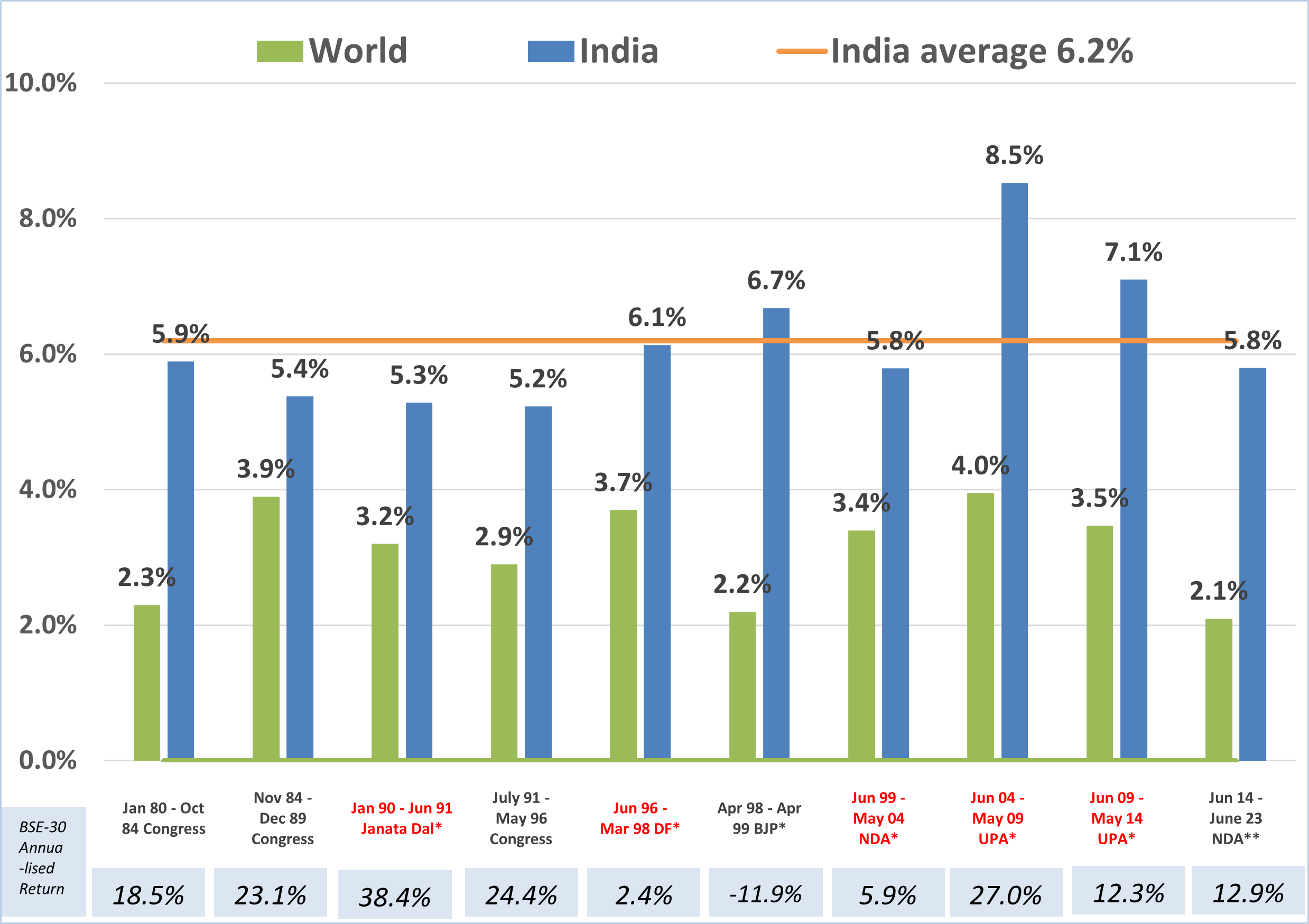 (Source- loksabha.nic.in; world bank; parties in red – coalition governments; in black – single party majorities; World GDP post 2020 is annual; 2023 GDP is estimate; India GDP uses old and new GDP series; Returns are for BSE-30 Index, From April 1998 is Total Returns Index in INR as sourced from Bloomberg Finance L.P; Analysis by Quantum Advisors)