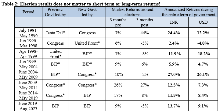 - Indian GDP and Indian stock markets are correlated. However, governments in power have no correlation to long-term GDP growth and long-term stock market returns.