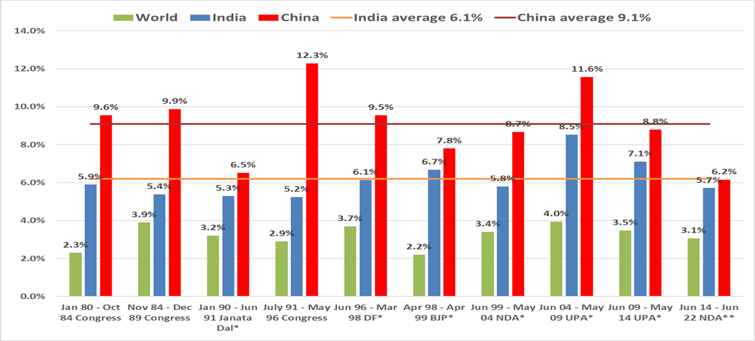 (source: GDP growth as per periods of political party in power. Data from loksabha, worldbank, world GDP for 2022 is annual data)