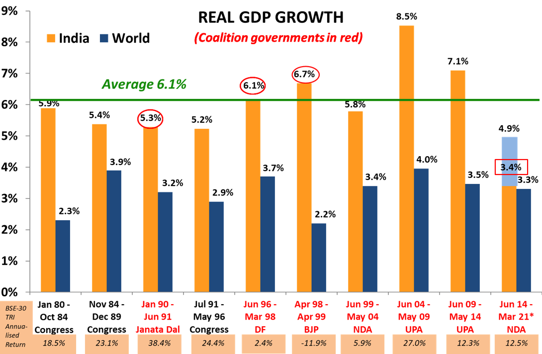 Source: RBI and www.parliamentofindia.nic.in as of March 2021. Note: The number in red rectangle is from a changed data series starting Jan 2015. While a “superior” series, there is no comparable number to equate the “New” with the “Old”. Most economists deduct 0% to 1.5% from the “New” to equate to the “Old”; therefore under Modi, the GDP has been at 5.9% at best matching the 5.6% under the BJP-led coalition government of Vajpayee that resulted in a rout for the BJP at the time of the next election in 2004!* Please note that data used for World GDP for 2017 is a median Estimate since World Bank data is not yet available and India GDP data is governments second advance estimate released at the end of May 2021.