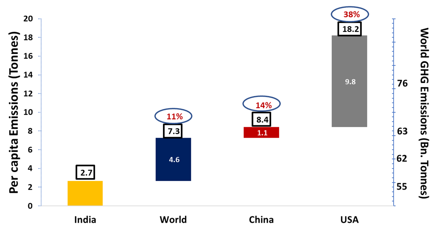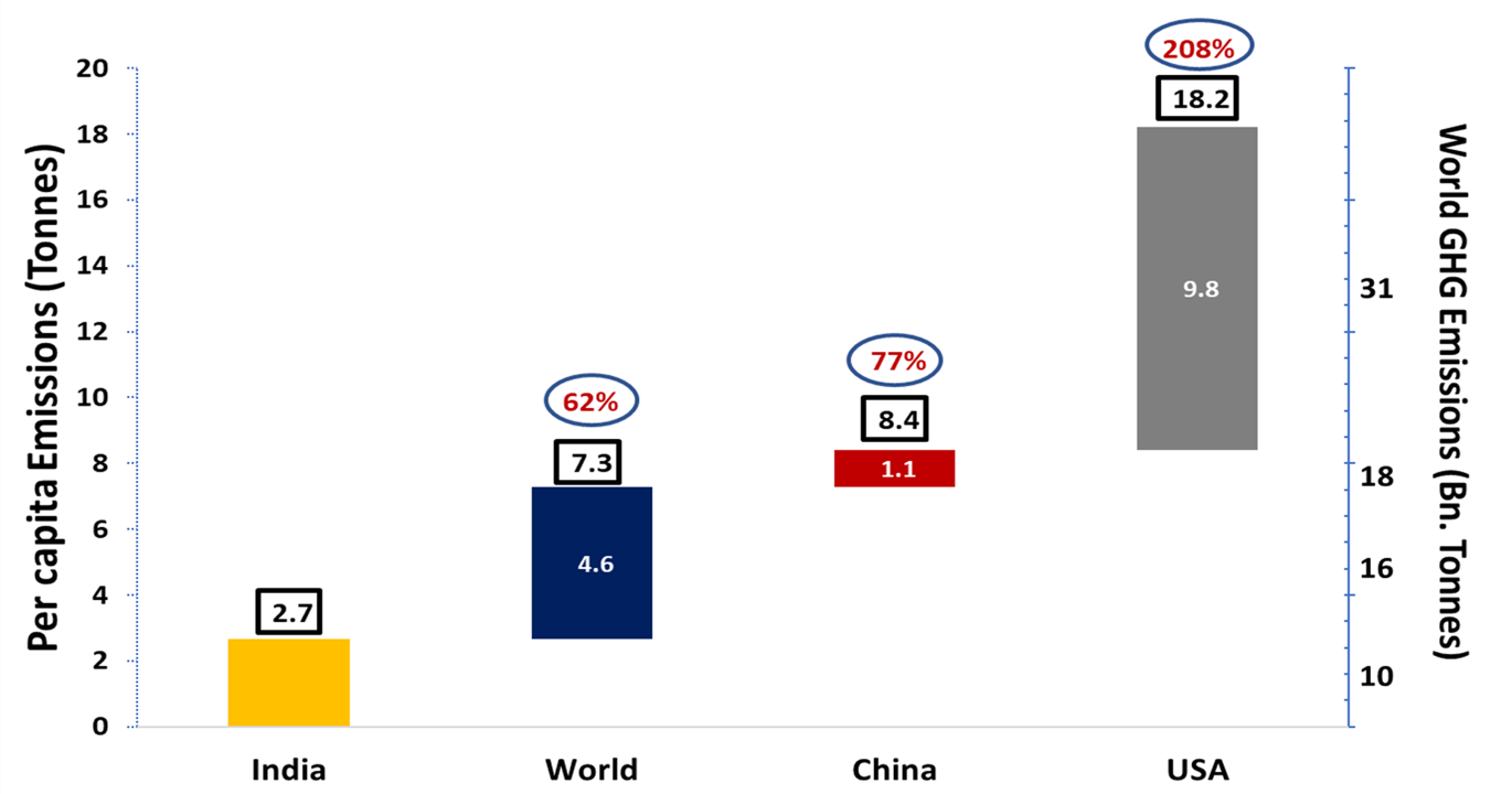 If an Indian was to have the same consumption habits as an American or European today, GHG will be 38% higher compared to the current global emission levels of 55 bn tonnes