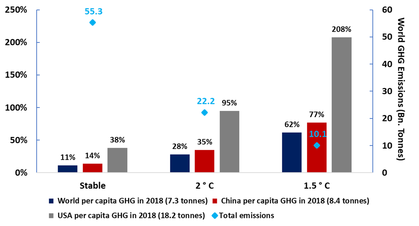 If an Indian was to have the same consumption habits as an American or European today, GHG will be 208% higher compared to the targeted global emission of 10 bn tonnes in a “1.5 C degree target” scenario