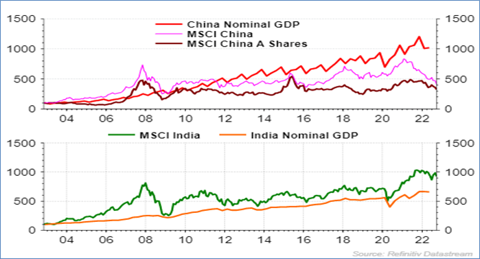 (Source: Refinitiv DataStream, All data in USD, GDP data is quarterly till June 2022, Index data is monthly till September 2022)