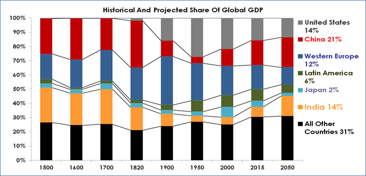 India’s weight in Global GDP will rise above 5% by 2030. It is expected to be ~15% by 2050.