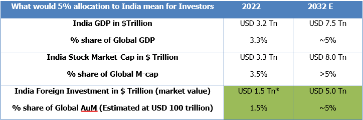 As per IMF’s recent estimates for 2022, India’s share of Global GDP in nominal terms will be ~3.35%. This share will rise to well above 5% over the next 10 years.