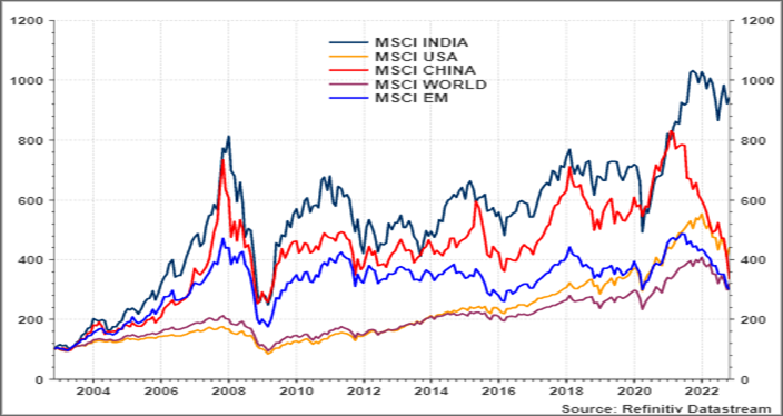 Source: MSCI Indices, Data in USD, 20 year data; rebased to 100 from November 2002 till October 2022