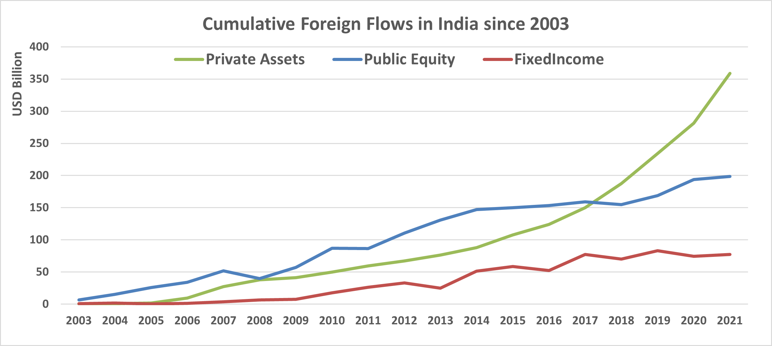(Source: NSDL, SEBI, IVCA, Annual Data till 2021; Private = Private Equity, venture Capital, Real Estate, and Infrastructure)