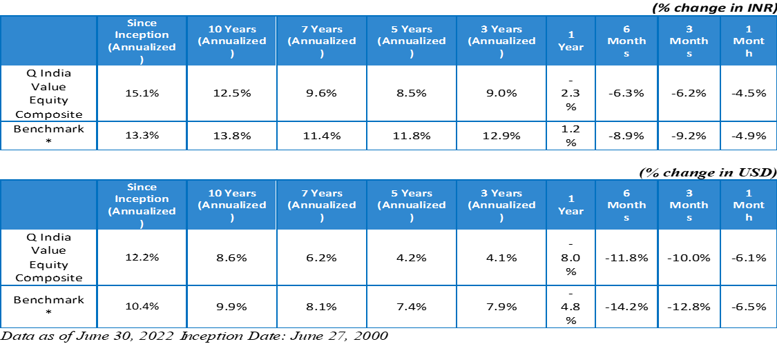 - The various constituents of the Composite pay different management fees. The net-of-fee and expense returns of the Q India Value Equity Composite indicated in this presentation reflect the weighted average management fees paid to Quantum Advisors Pvt Ltd (QAPL) by the different constituents of the Composite. The Composite represents 0.03% of the total AUM under the Q India Value Equity Strategy as on June, 2022.