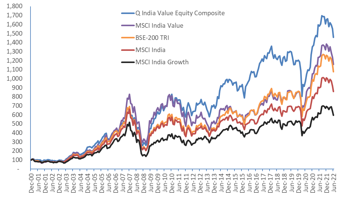 Source: Quantum Advisors, Refinitiv Datastream, MSCI Indices, in USD rebased to 100 on 31-Dec-2000 Data till June 30, 2022. Past performance is not an indicator of future returns. Please refer important disclosures and disclaimers