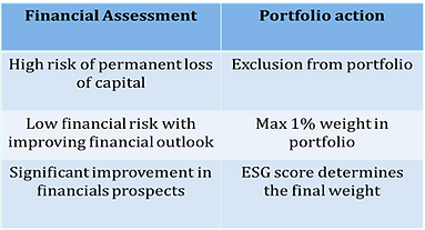 Ultimately, the weight of the stock in the portfolio is subject to this financial assessment. We avoid companies with potentially permanent loss of capital while financial stable companies are allocated ESG-score based weight.