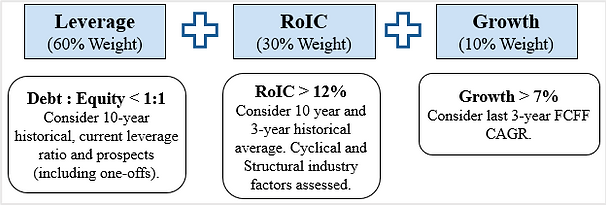 It is quite possible that a company has embarked on a large capital expenditure program that may increase leverage in the short term beyond our comfort of 1 time but leverage is expected to reduce as the new capacity starts contributing to revenues and profit ability. Therefore, companies meeting close to the minimum threshold are assessed on the current and future financial prospects. This exercise helps us to avoid traps where financial soundness meets looks fine today but is about to deteriorate and at the same time capitalize on opportunities where things are expected to improve significantly over the foreseeable future.