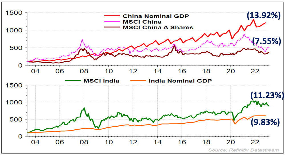 Source: Refinitiv DataStream, All data in USD, GDP data is quarterly till Sep 2022, Index data is monthly till April 2023