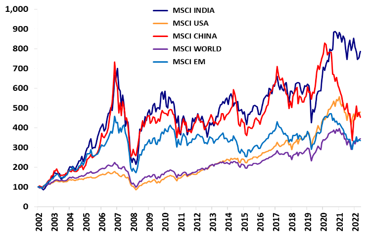 Source: MSCI Indices, 20-year data; rebased to 100 from December 2002 till April 2023
