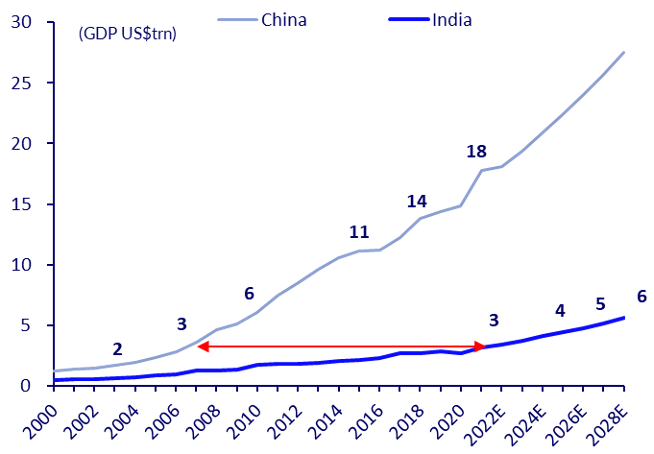 China caught the tailwind of global exports driving GDP growth which may no longer be an opportunity. India may not match Chinese growth rates. However, India has focussed on developing its domestic consumption market and with many people entering the labour force domestic consumers will be the primary driver of GDP growth which is expected to be far superior over the next few decades versus any large global economy.