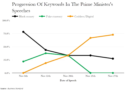 The demonetization already has over 30 modifications to it since its announcement on November 8, 2016 – including the changing narrative based on the Prime Minister’s speeches (Graph above). We have no idea what the government will amend or modify next.