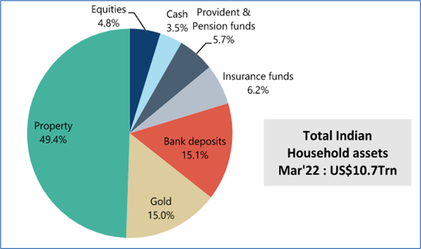 Finally, the main resilience comes from the Indian households(HHs). Household debt though rising is well below global averages. Also, the Indian household is a smart asset allocator. About 50% of the HHs is land/property; about 30% is cash, deposits, and insurance; another 15% is in Gold. These are stable long-term assets as compared to volatile stocks and mutual funds.