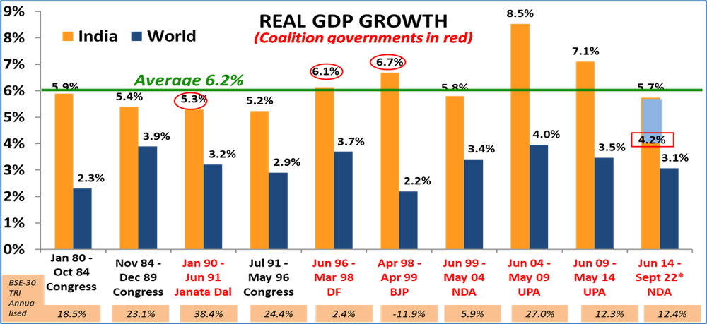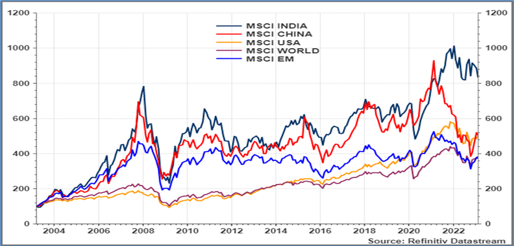The fact that during the last 40 years, the Indian Real GDP growth has averaged above 6% is a testament to this. In the last 20 years, India's Stock indices have returned 2x over the US and grown much more over EM, and China to the dismay of the many who have remained under-allocated to India.