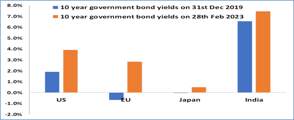 India is also at about its long-term average interest rates. Indian companies, financial firms, households and investor are used to dealing and managing with interest rates around the 7%-8% level. This is different in the western world. Current interest rates are so much higher than levels seen in the last 15 years.
