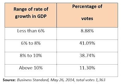 An online survey (Table) suggests that 50.04%, a tantalising slim majority but a majority nonetheless, expect Prime Minister Modi's economic policies to result in India achieving >8% real rate of growth in GDP over the next 4 years. Given that India is at a sub-5% level of growth - and the global environment is what it is - that is indeed a lofty (but not impossible) expectation.