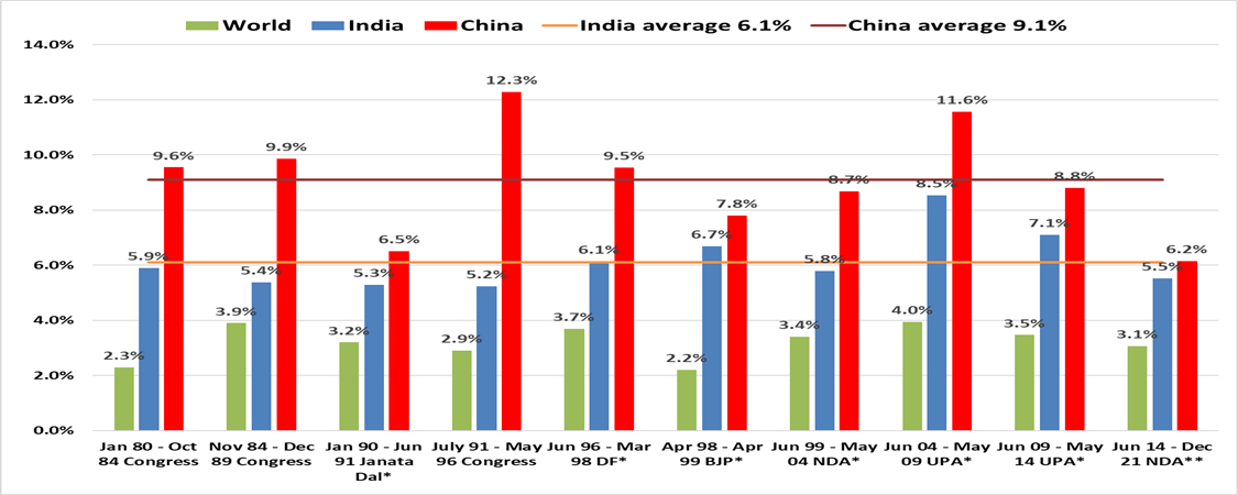 However, the long outcome of an independent political democracy with limited economic freedom and adverse geo-political choices, meant that India in first 30 years of its existence did not achieve its potential. Real GDP growth averaged 3.5% and per-capita incomes grew at less than 2%.