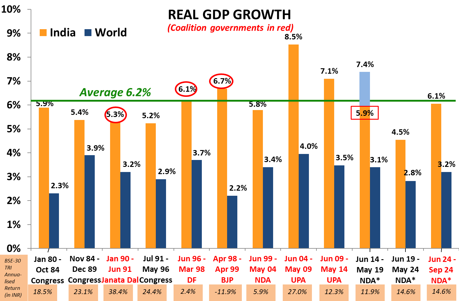 Chart 1: India Real GDP growth has averaged between 6.0%-6.5% across different governments. Since 2000, the real GDP growth has averaged 6.2%; similar to its average since 1980
