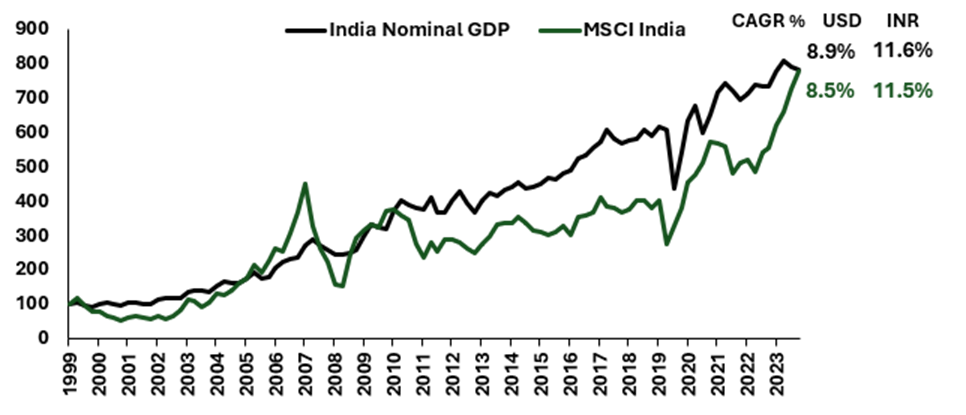 On the other hand, this real GDP growth since 2000 has led to double-digit growth in nominal GDP (CAGR 11.6% in INR) / (8.9%in USD ), which is reflected in the Indian Stock Market Returns as represented by MSCI India Index ( CAGR 11.5% in INR) / 8.5% in USD ).(data as at September 2024, see the charts at the end of the article). Despite India’s requirement of private capital, unless allocators to private investments assess and price the governance risk correctly, investing in public equities may offer a superior risk/reward outcome.