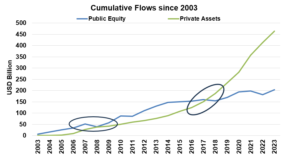Source: Quantum Advisors NSDL, IVCA, Private Assets includes Private Equity, Venture, Infrastructure, Real Estate, Private Flows are Gross and does not include exits; Annual Calendar year data till 2023)