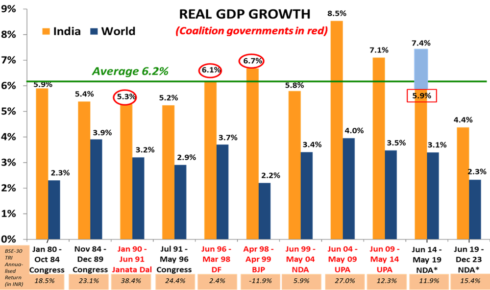 However, as we have noted, Elections and the party in power, be it of the left or the right, single party or coalition, weak man or strong man, has not altered India’s economic trajectory of growing at 6.0%-6.5% real GDP. All parties in power follow a steady blue print of broad reforms.