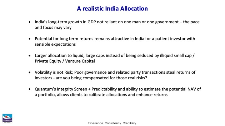 Our experience over the last 30+ years has taught us to be realist about our expectations from politics, economy and hence from market returns. We believe that a realistic long-term India allocation should be overly biased and allocated to a strategy which offers sensible, risk adjusted and predictable outcomes.