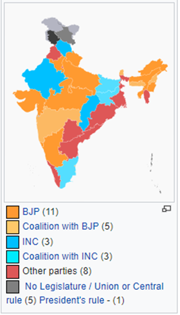 As the chart on the left shows, of the 28 states and 8 Union Territories that India has, BJP and its allies are in power in only 16 of those states. They control the Centre but are not in power in many states. This has significance on how much Modi and BJP can influence social, political, and economic activity.