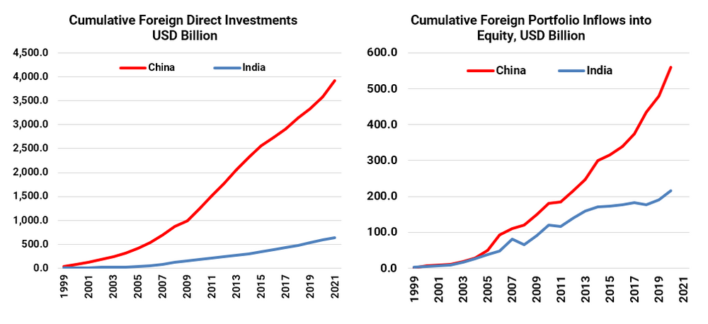 China has grown and has access to domestic capital for its growth. It also has the technology in basic industries to support its economy. India is entering its demographic growth path and requires capital and technology to fund its growth aspirations.