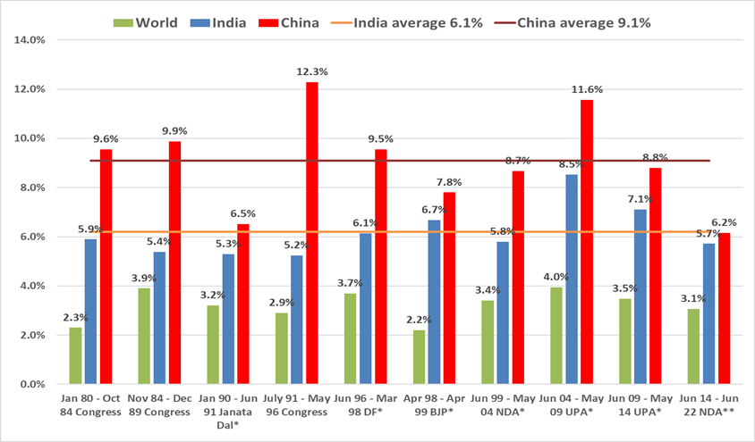 (Source: GDP growth as per periods of political party in power. Data from Lok Sabha, World Bank, world GDP for 2022 is annual data)