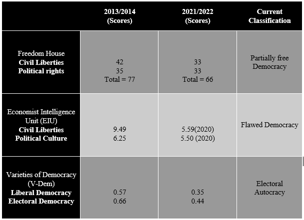 There are indeed some socio-political concerns about PM Modi, the Bharatiya Janata Party (BJP), and the ideological mothership Rashtriya Swayamsevak Sangh (RSS). The party’s social stance towards 200 million Muslims; the corporate consolidation and the party’s hold on media and press; the use of central agencies to target political opponents; the opaque political funding; the tight restrictions on NGO’s to secure overseas funding. These are all aspects which can curb democratic rights and thus reflect in the fall in scores.