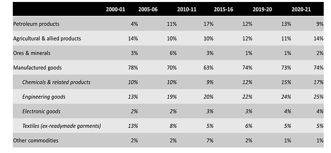 (Source: CMIE; MEITY ; Exports table is % share of total exports); PLI – Production Linked Incentive Scheme, Data as at June 2021)