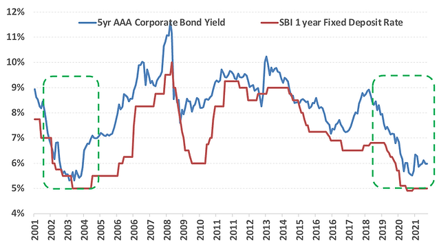 Indian Banks today own more than 10% in excess government bonds. In absolute terms, they can sell government bonds worth more than INR 15 trillion without raising new equity or depending on the RBI for funding and lend that money. The flip side to that is the chart on the right, where the unprecedented credit growth in the 2003-2008 period led to an increase in bond yields as banks sold low yielding government bonds to fund credit.