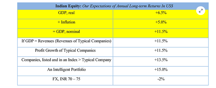 The recovery since has been much better than expected and has raised hopes. However, will India get back to a higher growth trajectory? India needs sustained long-term growth to pull people out of poverty, create jobs for the young and to boost incomes to widen the consumption base. That growth, as the table below shows, then reflects in the long-term return potential in the India asset markets.