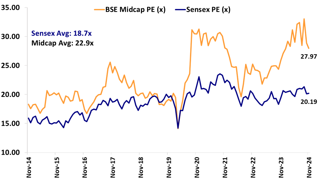 (Note: BSE Midcap Index and Sensex 1Y Forward PE. Source: Bloomberg Finance L.P.; As of November 30, 2024 Past performance does not guarantee and is not indicative of future results. )