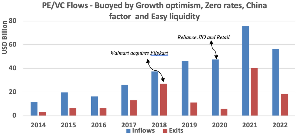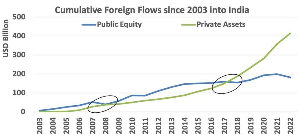 (Source: NSDL, IVCA, Private Assets includes Private Equity, Venture, Infrastructure, Real Estate, Private Flows are Gross and does not include exits; Annual Calendar year data till 2022)