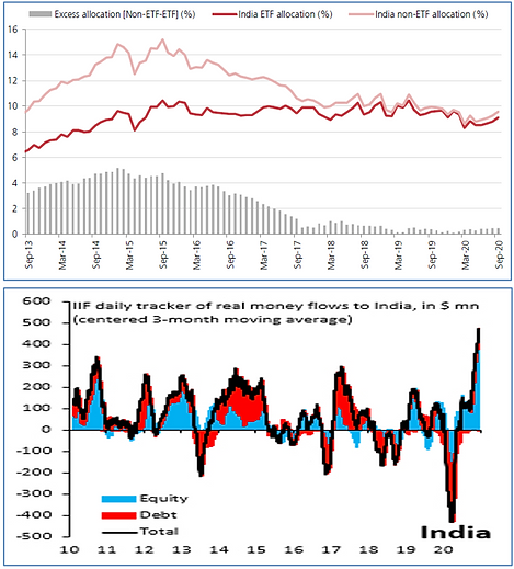 Low growth in earnings and slower GDP growth had led foreigners to cut their India over-allocation. Given the background and the recent non-ETF flows, we may be seeing foreigners increasing their active India allocations. So despite selling by domestic investors and the relative over-valuation from an historical perspective, Indian equity markets have climbed towards all-time highs on the back of foreign flows.