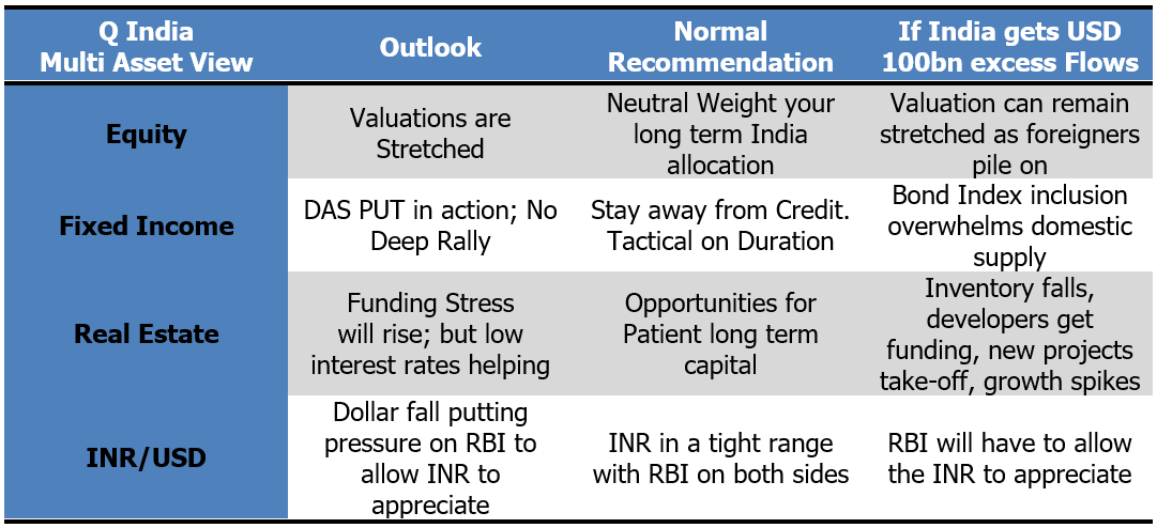 Despite the size and depth of the Indian Bonds, Equity and Real Estate markets, excess inflows of such order will have its impact on market valuations. We may have seen the first wave of such flows in the Indian equity markets over the past 4 months. If India is indeed able to attract such large excess inflows over the year, we expect the Indian rupee to remain strong, interest rates to remain low, liquidity to remain comfortable and equity valuations to remain high.