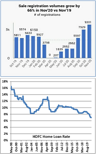 Low home loan rates, cut in stamp duty rates (in certain cities), consolidation of real estate developers and completion of existing projects are seen to be major reasons for why enquiries and sales have picked up. Registrations jumped by 66% Y-o-Y, boosted by a stamp duty cut and the festive mood of Navratri and Dussehra.
