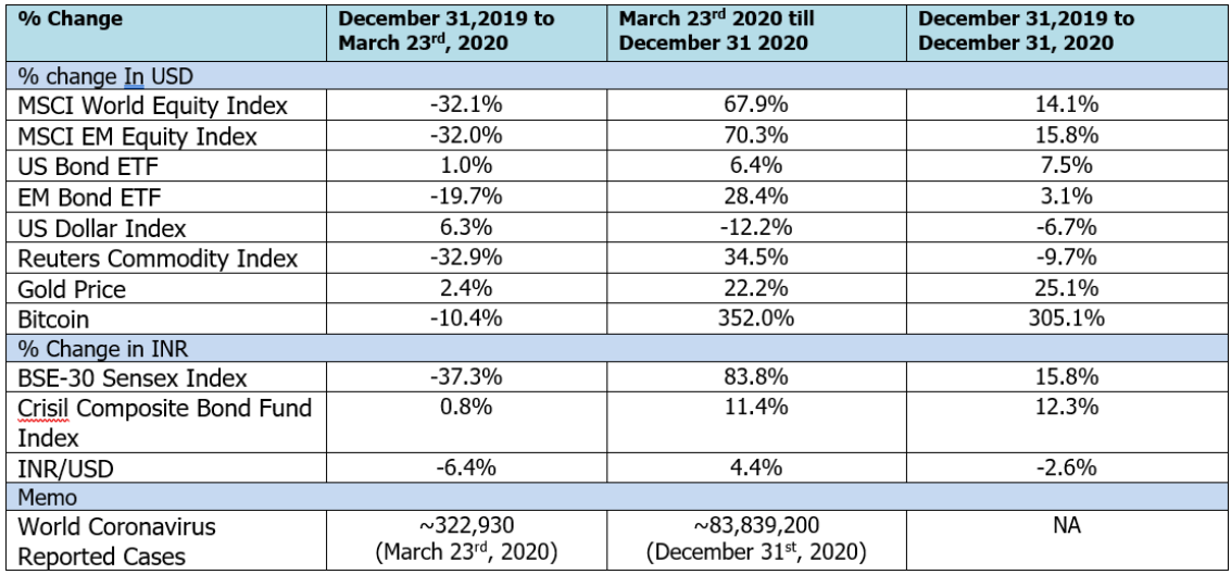 Global Equity markets bottomed on March 23rd, 2020. As the year ends, many indices are at/or near all-time highs. The cumulative global reported coronavirus as on March 23rd, 2020 was 322,930. On December 31st 2020, the reported cases stood at 83,839,200. There have been more than 300,000 deaths in the United States alone.
